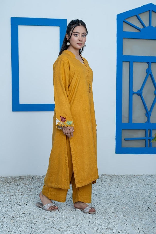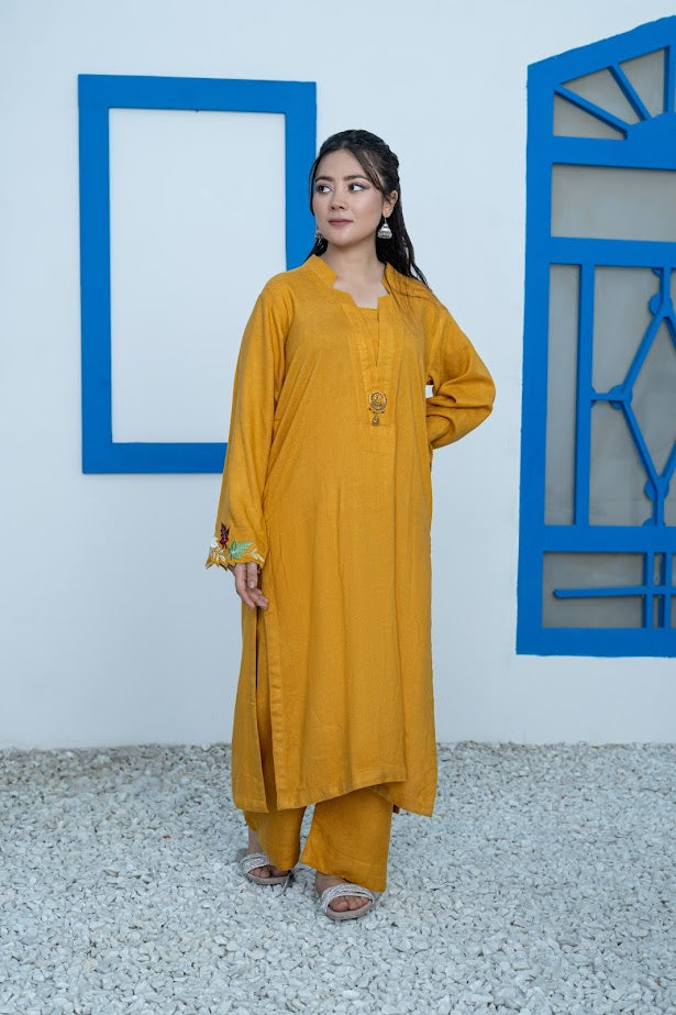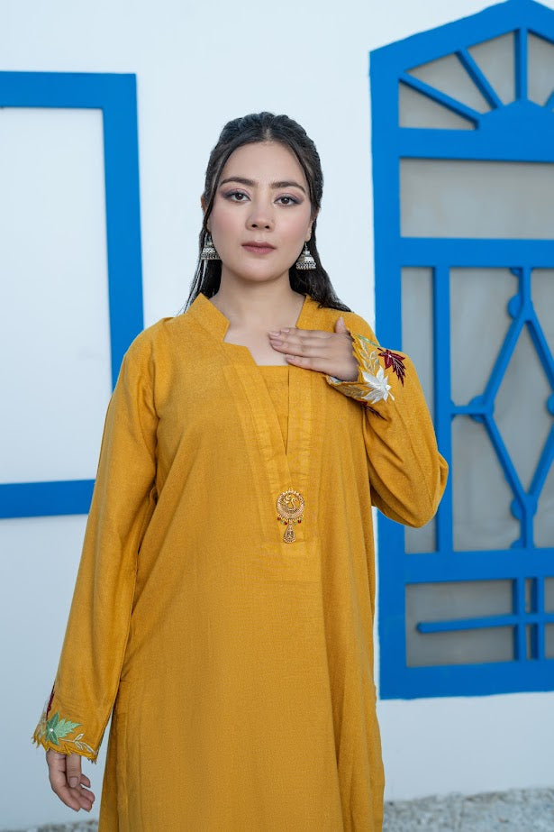 This peach wool garment features delicate embroidery on the sleeves and a solid color design, making it an ideal choice for summer wear. The ornament embellishment on the front adds a traditional touch, blending elegance with contemporary style. Its lightweight and cozy fabric ensure comfort throughout the day, making it both trendy and practical for warm weather.