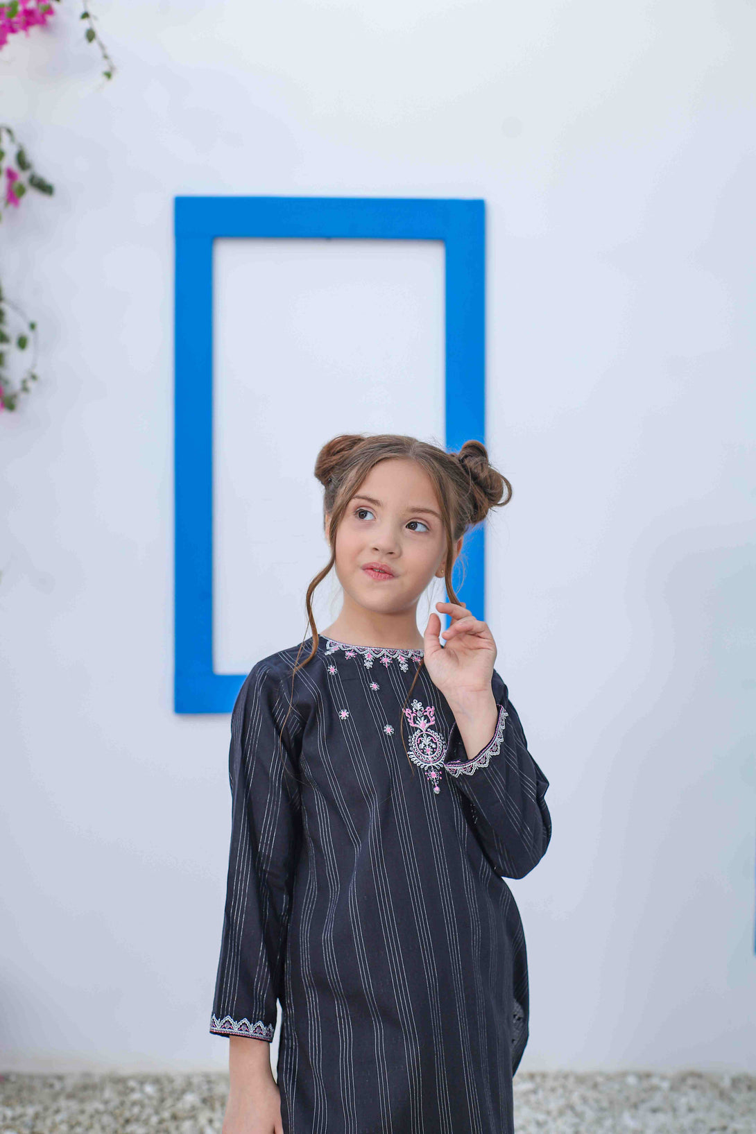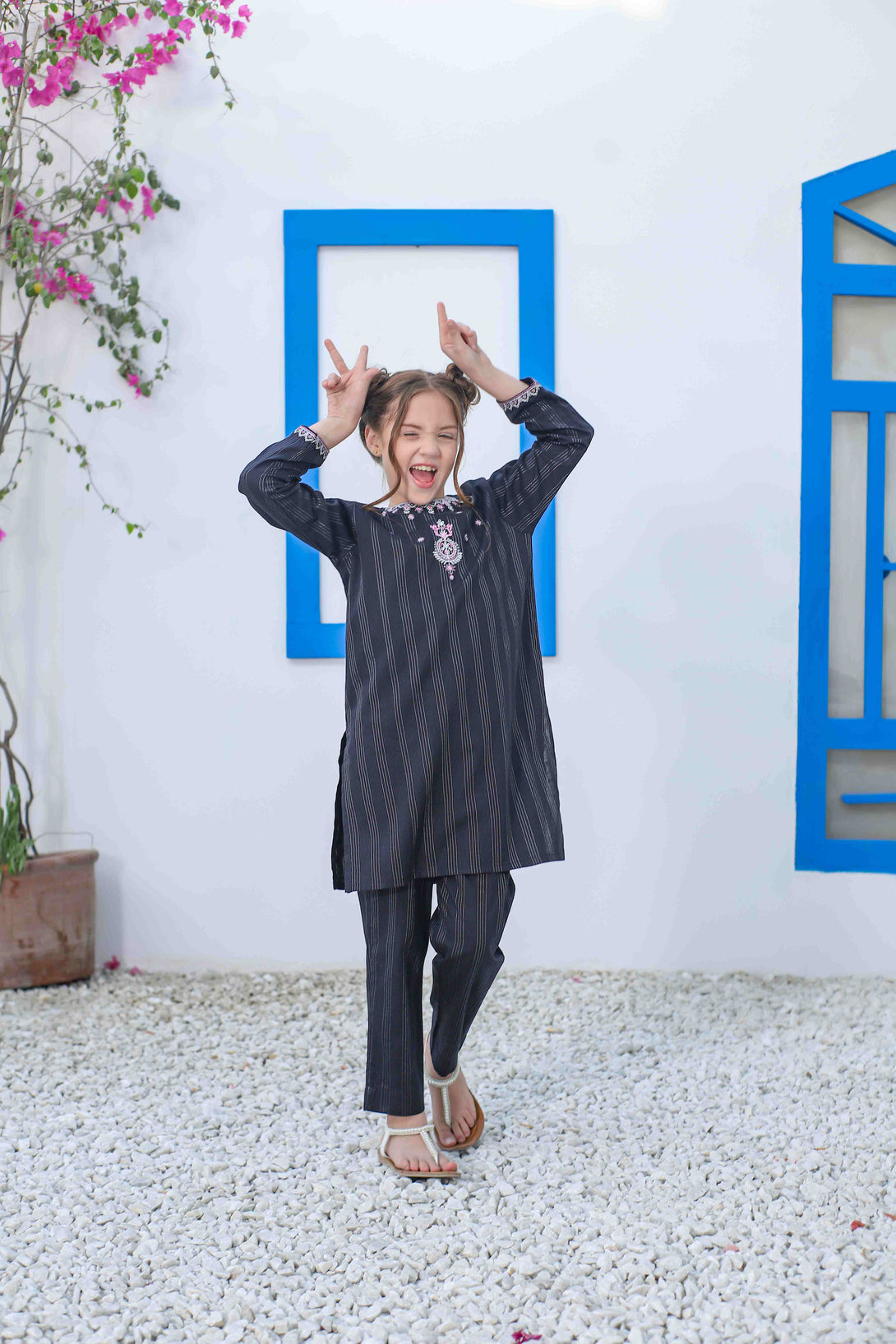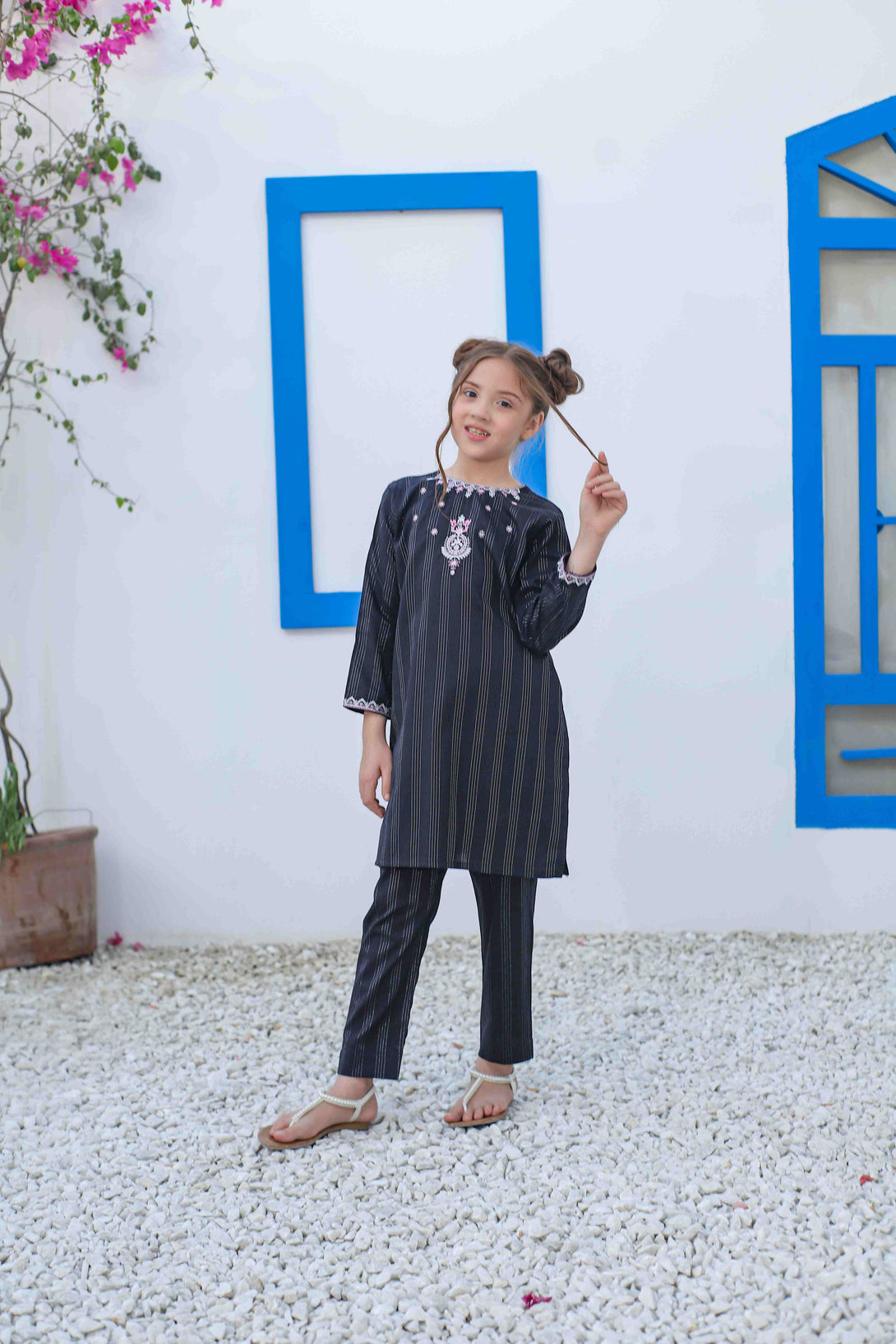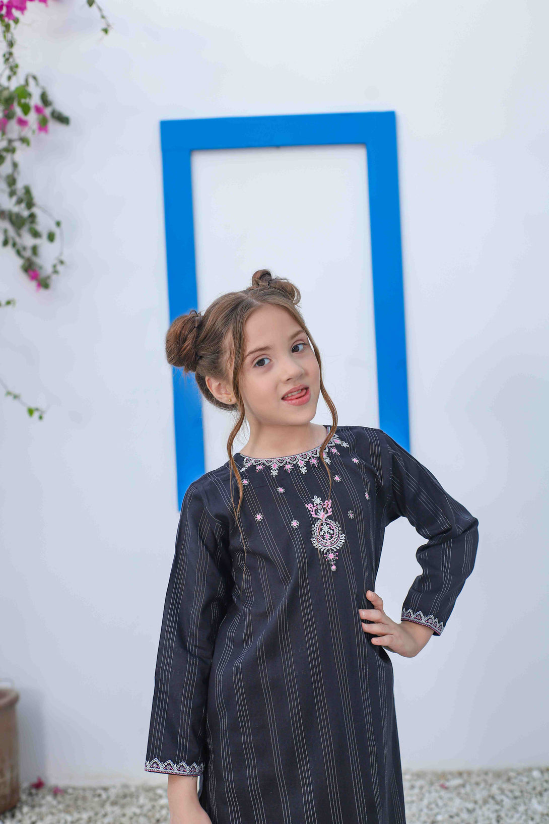 Elevate your wardrobe with this sophisticated black jacquard ensemble featuring contemporary embroidery on the neckline and sleeves, accentuated with pink embroidered details. The short shirt paired with straight-cut pants creates a balanced silhouette that's both comfortable and fashion-forward. Perfect for those who appreciate refined craftsmanship without compromising on comfort.