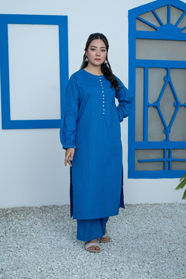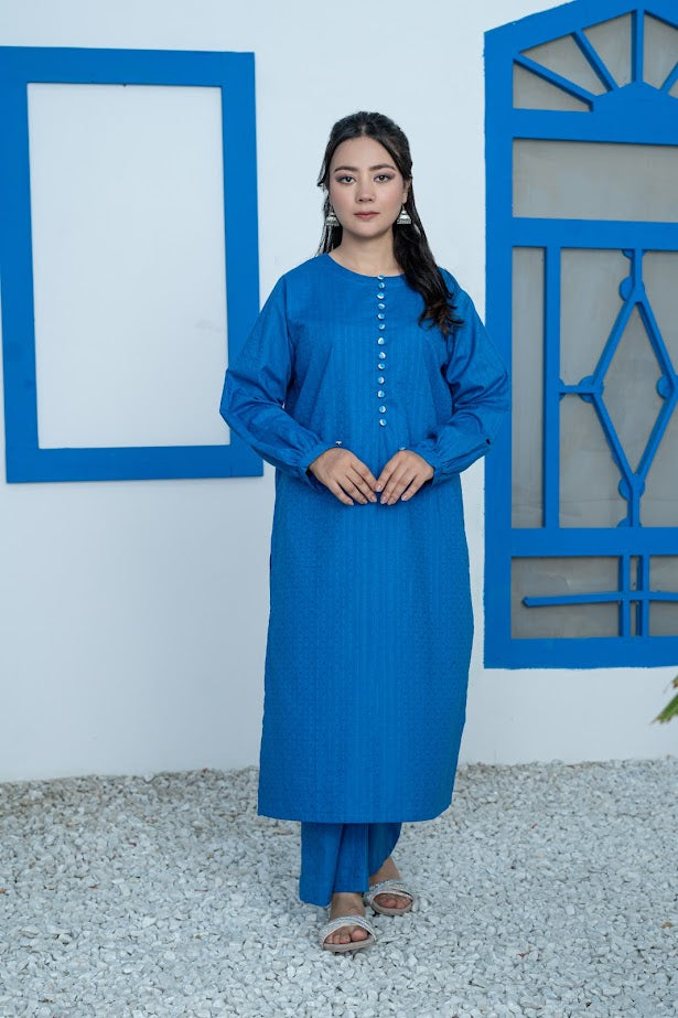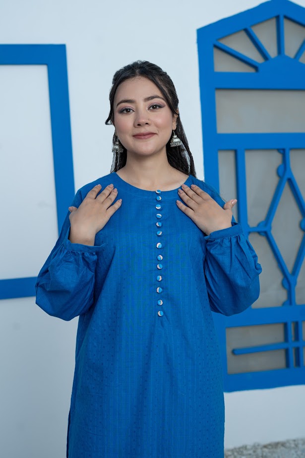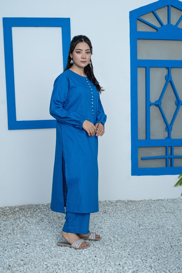 This elegant blue jacquard ensemble features a long shirt paired with straight pants, designed for a smart and polished appearance. The loop buttons add a refined detail, enhancing the sophisticated look. Crafted for comfort, this outfit ensures you stay stylish and at ease all day long. Ideal for professional settings or formal occasions, it combines classic tailoring with modern elegance.