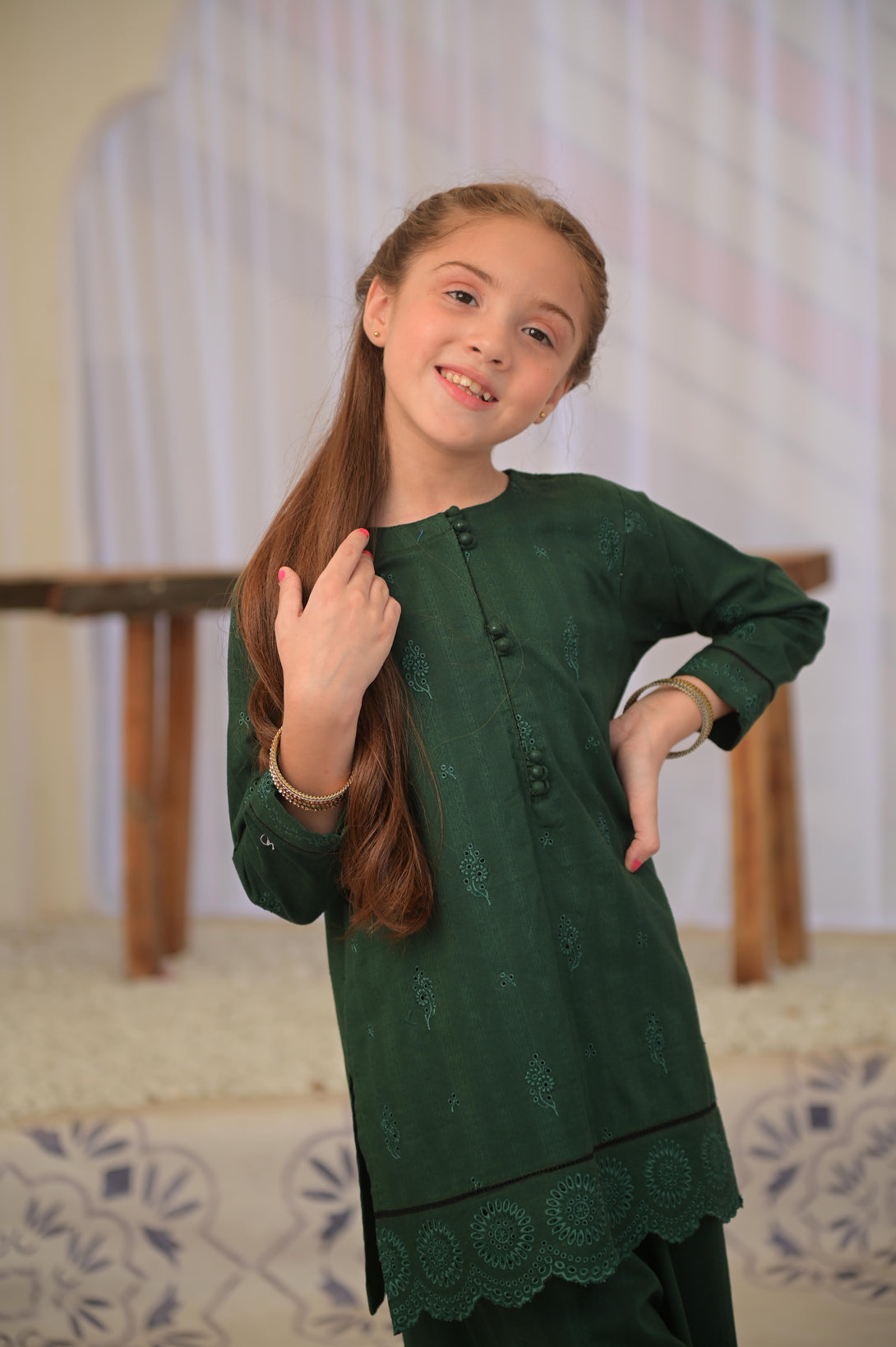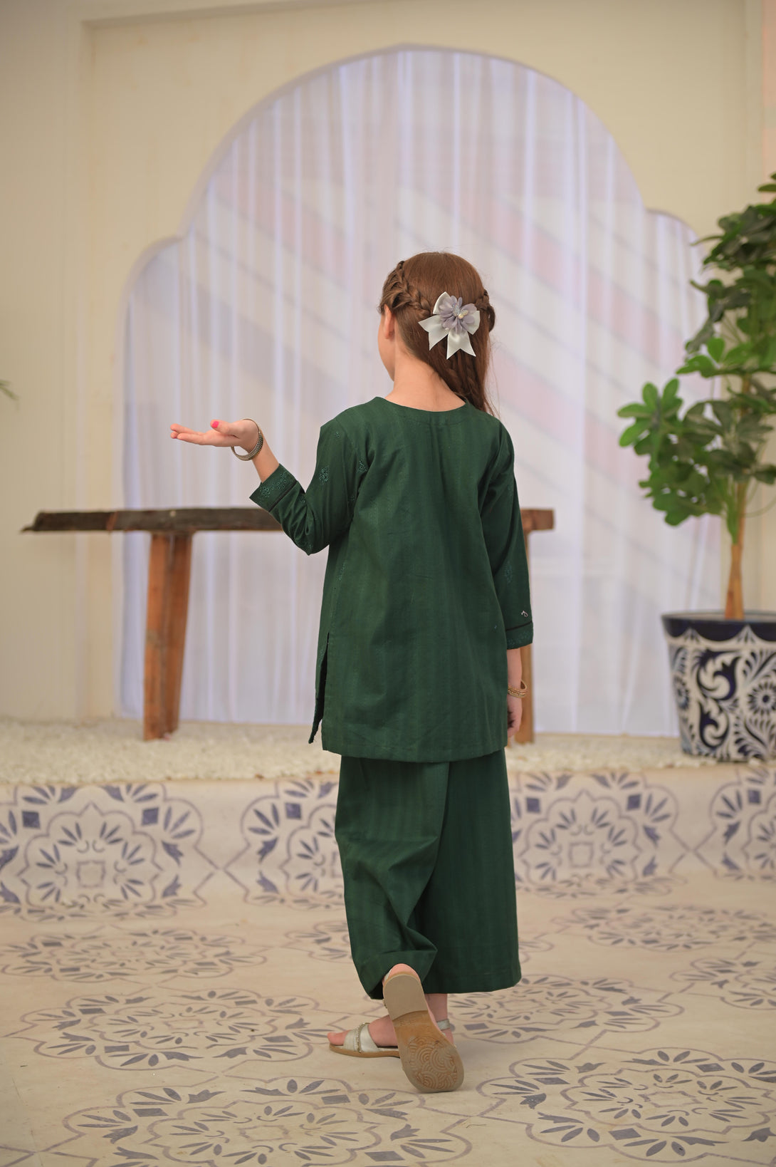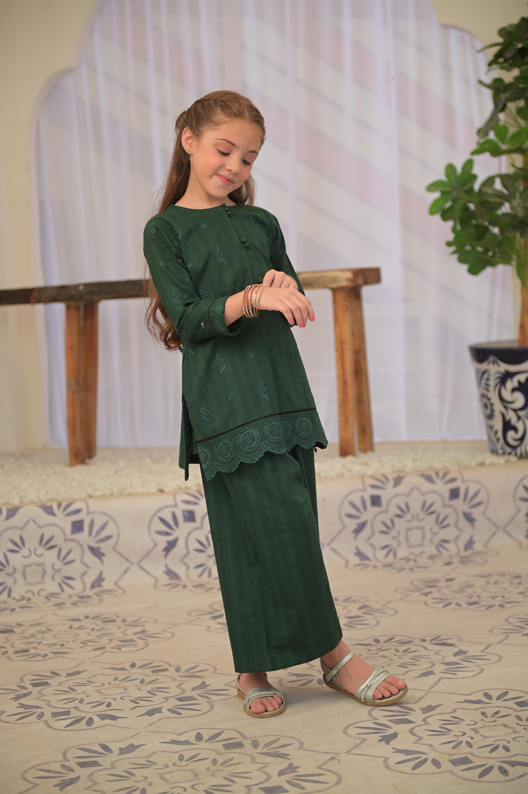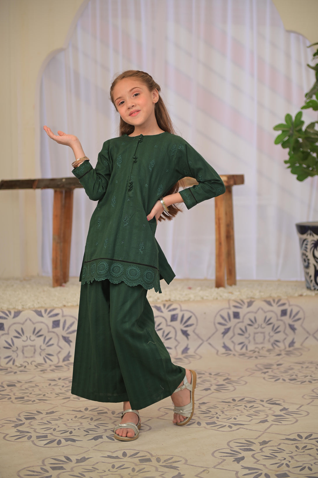 This elegant ensemble features a bottle green self-jacquard fabric enhanced with intricate schiffli embroidery, creating a refined texture and visual depth. The combination of a short shirt and matching plazo offers a chic silhouette that balances tradition with contemporary style, perfect for sophisticated occasions. The carefully crafted details ensure a polished and graceful look, making it a standout choice for those seeking understated elegance.