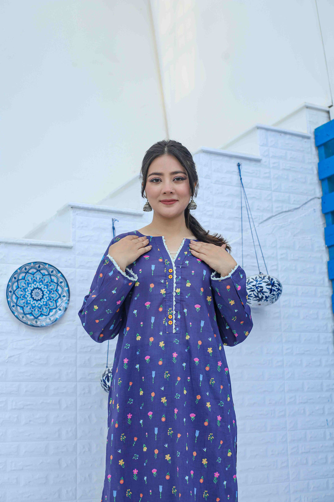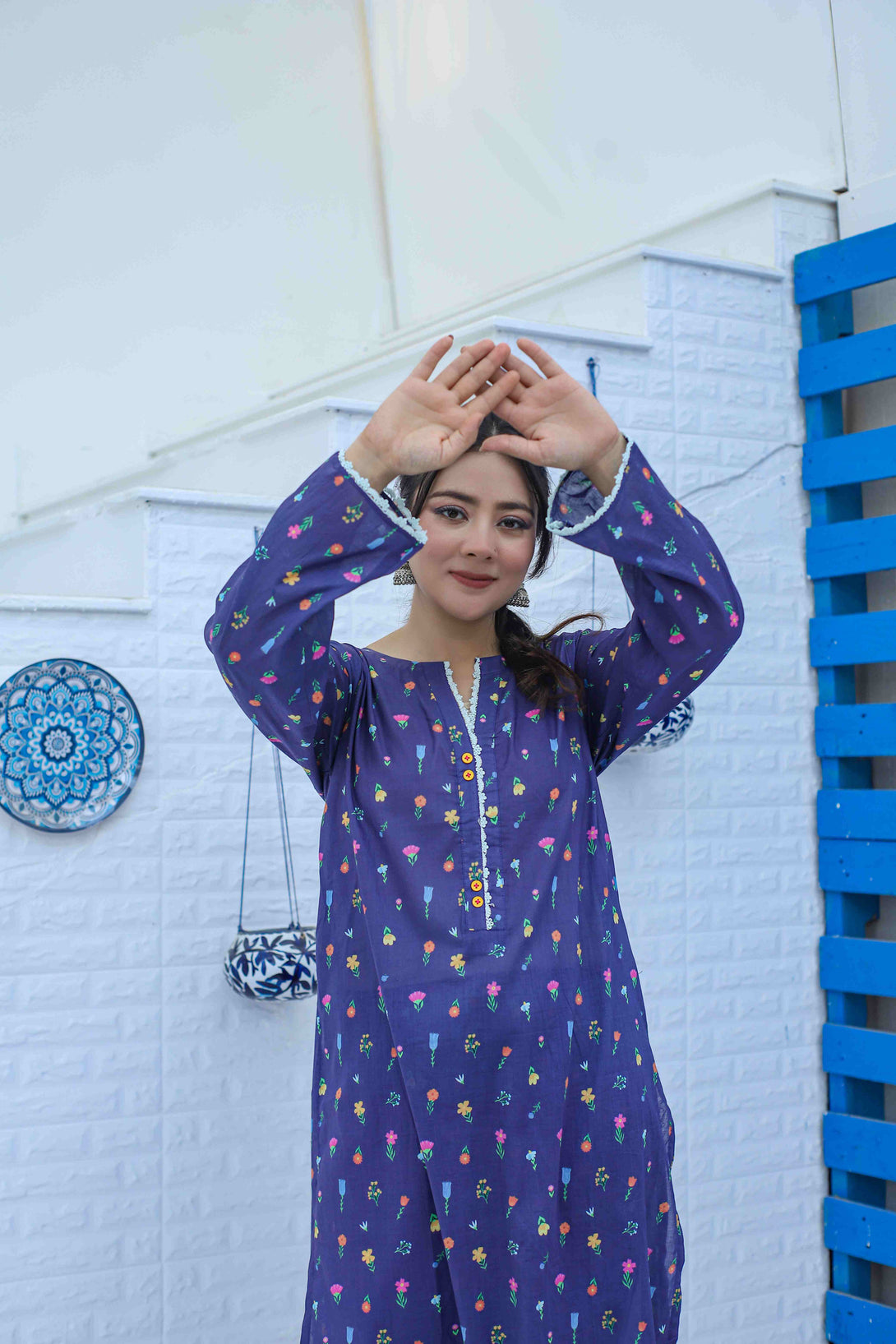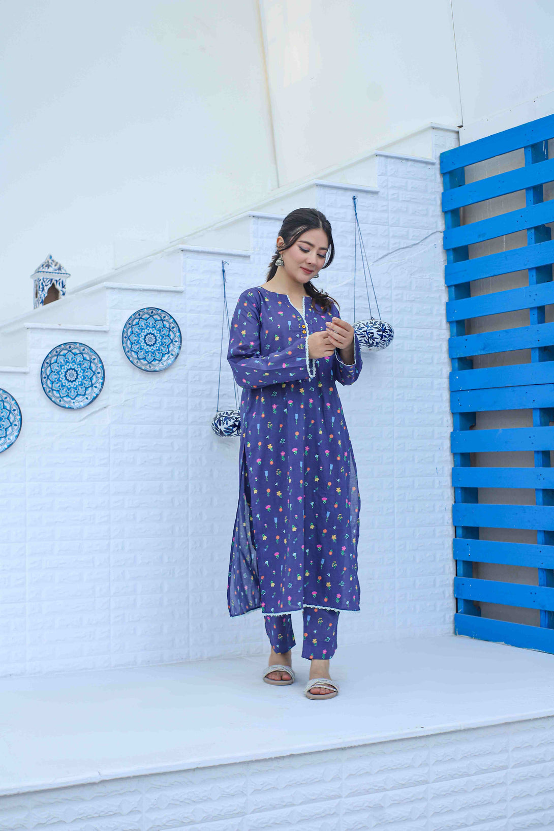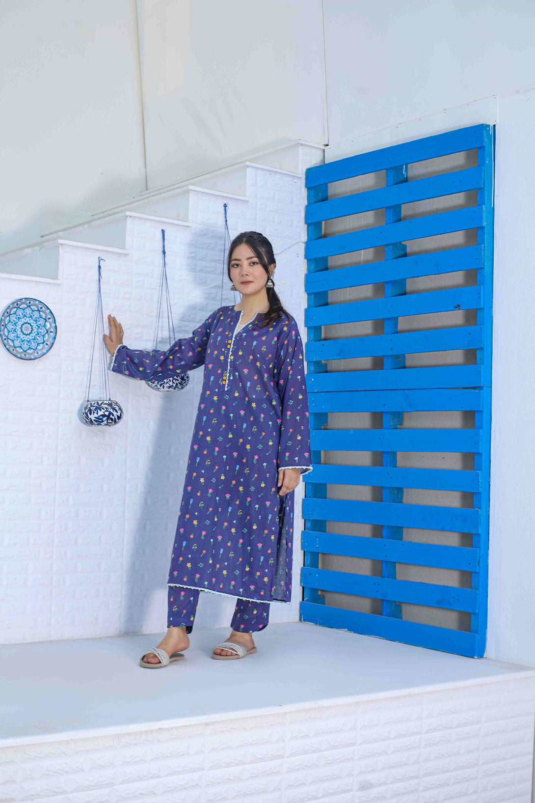 Expertly crafted mauve printed long shirt paired with straight cut trousers. This ensemble offers both breathability and sophistication during warm weather, with the vibrant purple pattern adding a distinctive touch to your summer wardrobe. The classic silhouette ensures versatility for various occasions while maintaining effortless style.