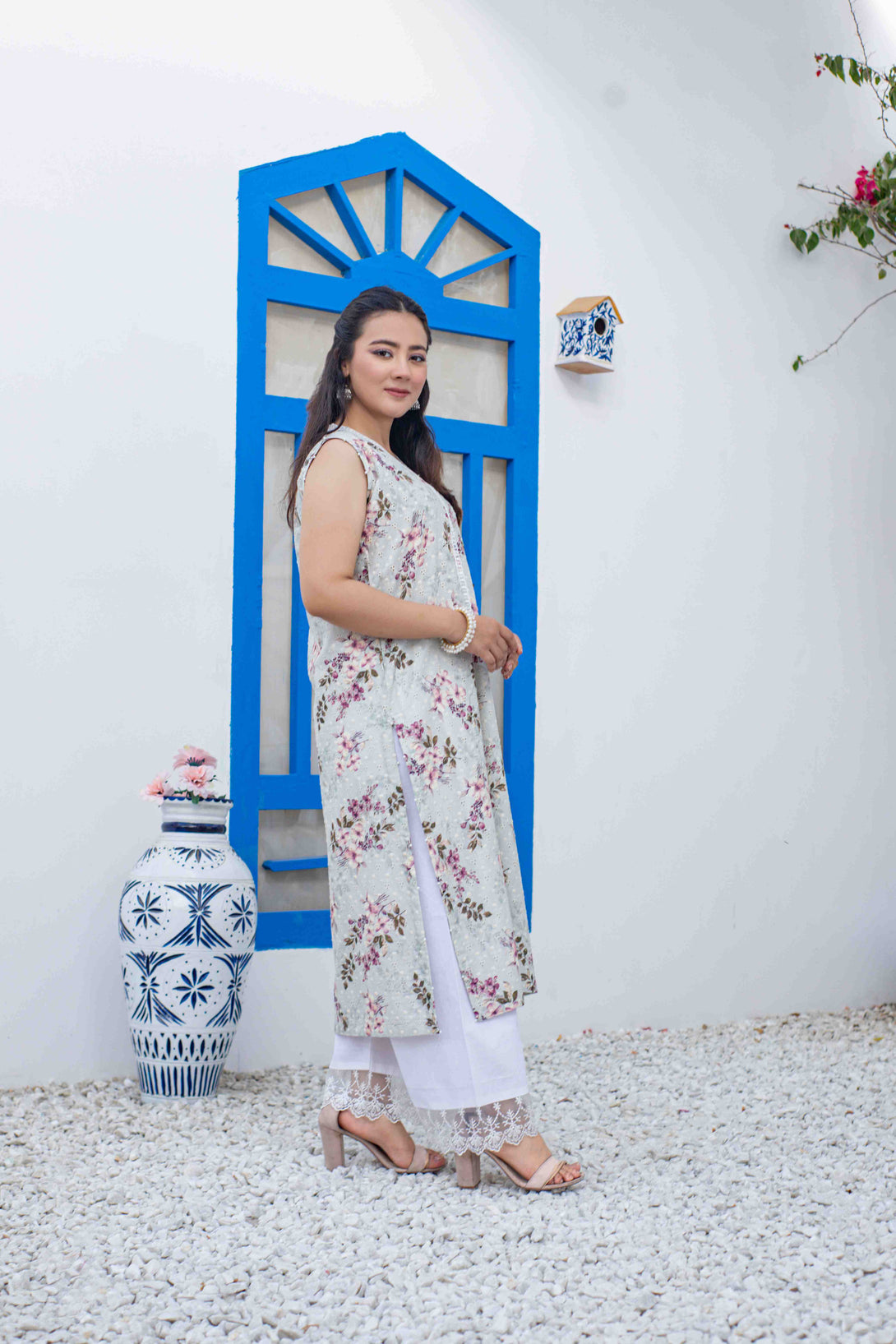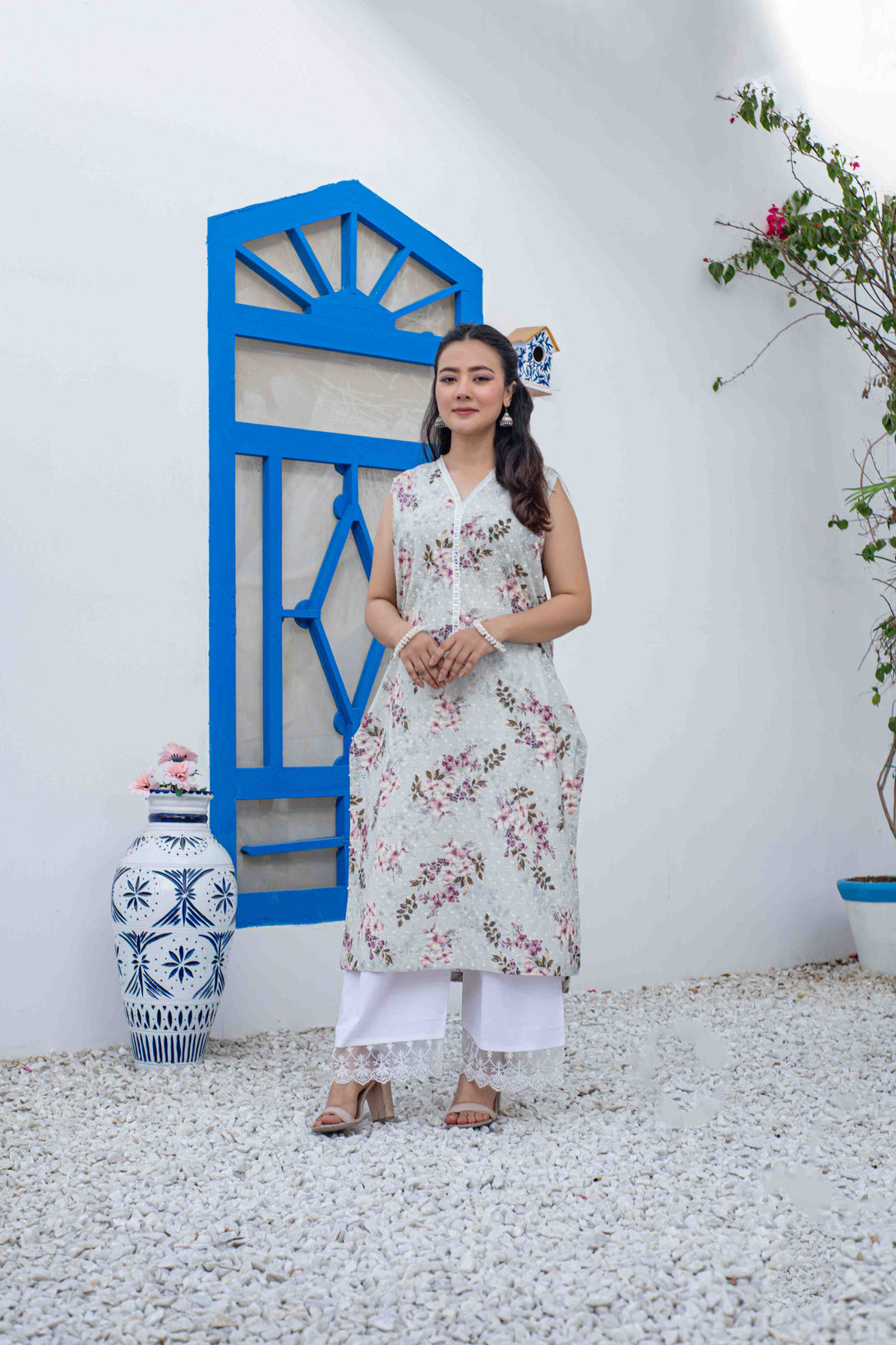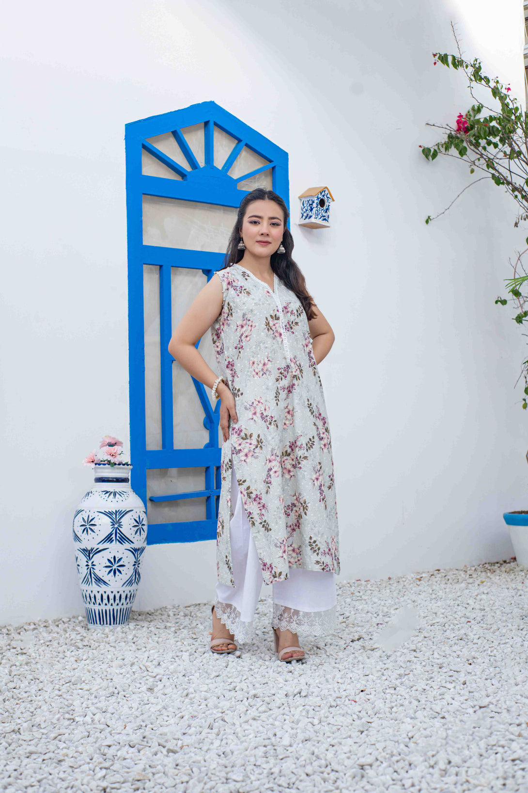 Crafted from luxurious chikankari lawn, our Meadow top boasts a modern cut and sleeveless design for a chic look. Adorned with stunning pearl embellishments and paired with a delicate lace plazo, this top exudes sophistication and elegance. Elevate your style with Meadow.