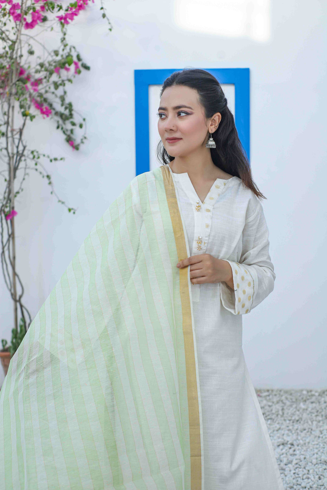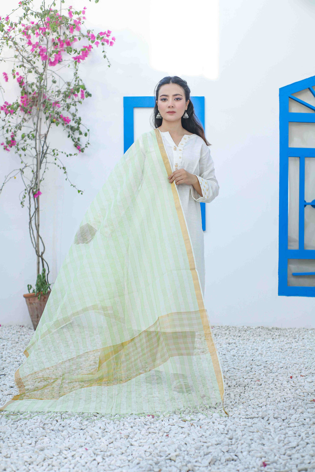 Elevate your ensemble with our Naqsh khaddi dupatta featuring sophisticated green, off-white, and gold striped patterns. Meticulously crafted with traditional khaddi weaving techniques, this premium textile offers lightweight elegance and remarkable texture. The harmonious color combination ensures versatility for both formal occasions and everyday wear.