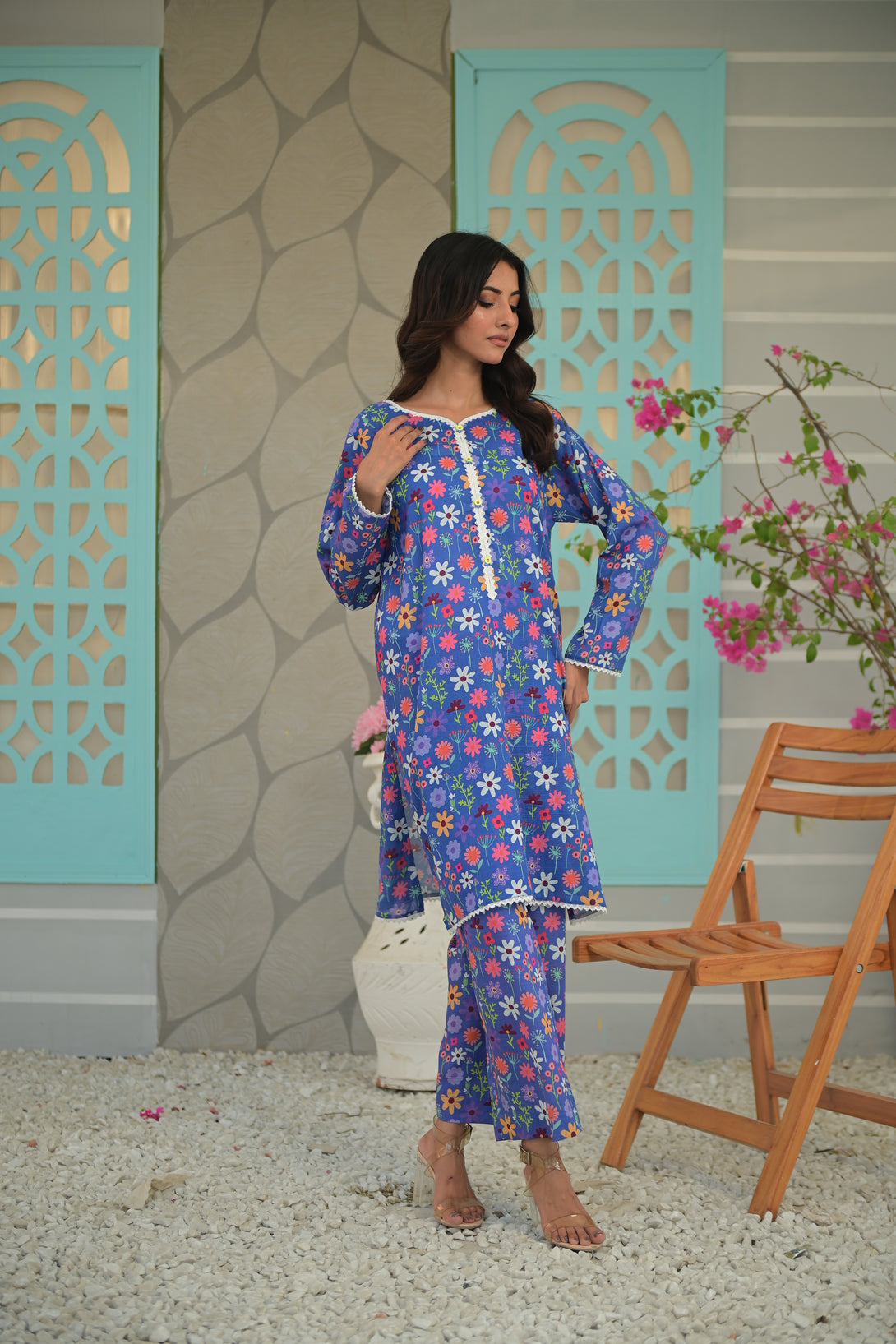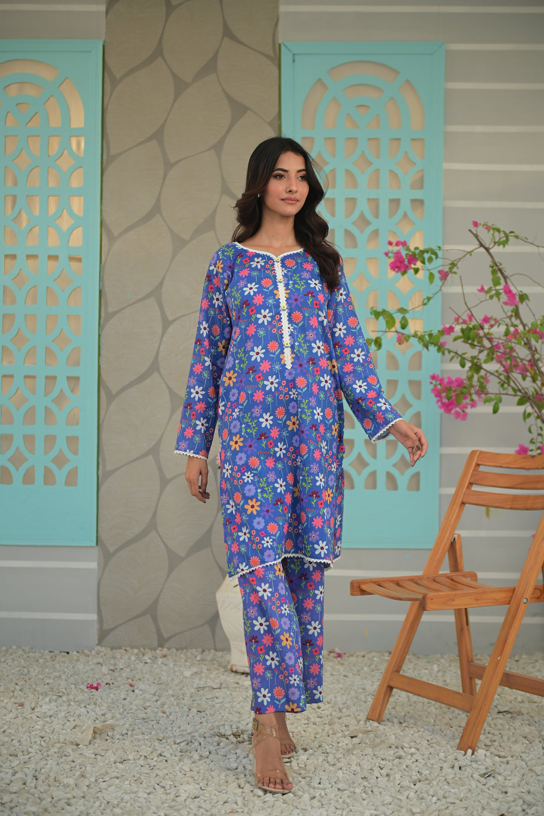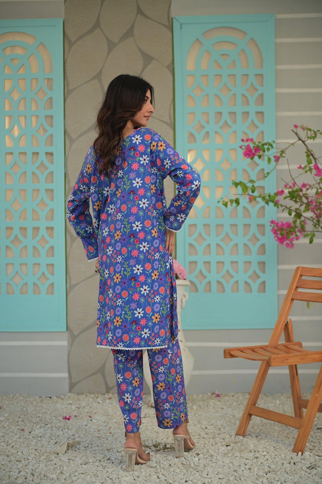 This elegant ensemble features a blue printed khaddar fabric, known for its durability and comfort. The straight shirt is enhanced with delicate lace embellishments, adding a refined touch to the classic design. Paired with loose trousers, this outfit offers both style and ease of movement, making it an ideal choice for sophisticated, everyday wear.