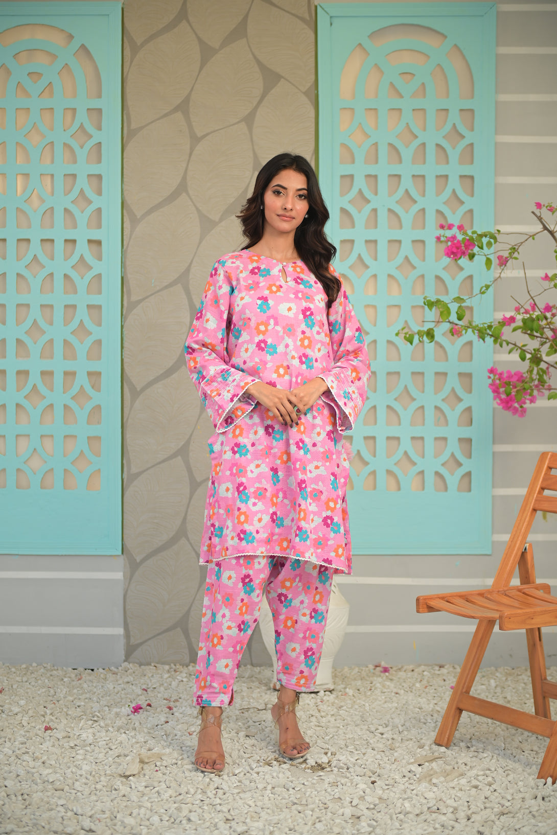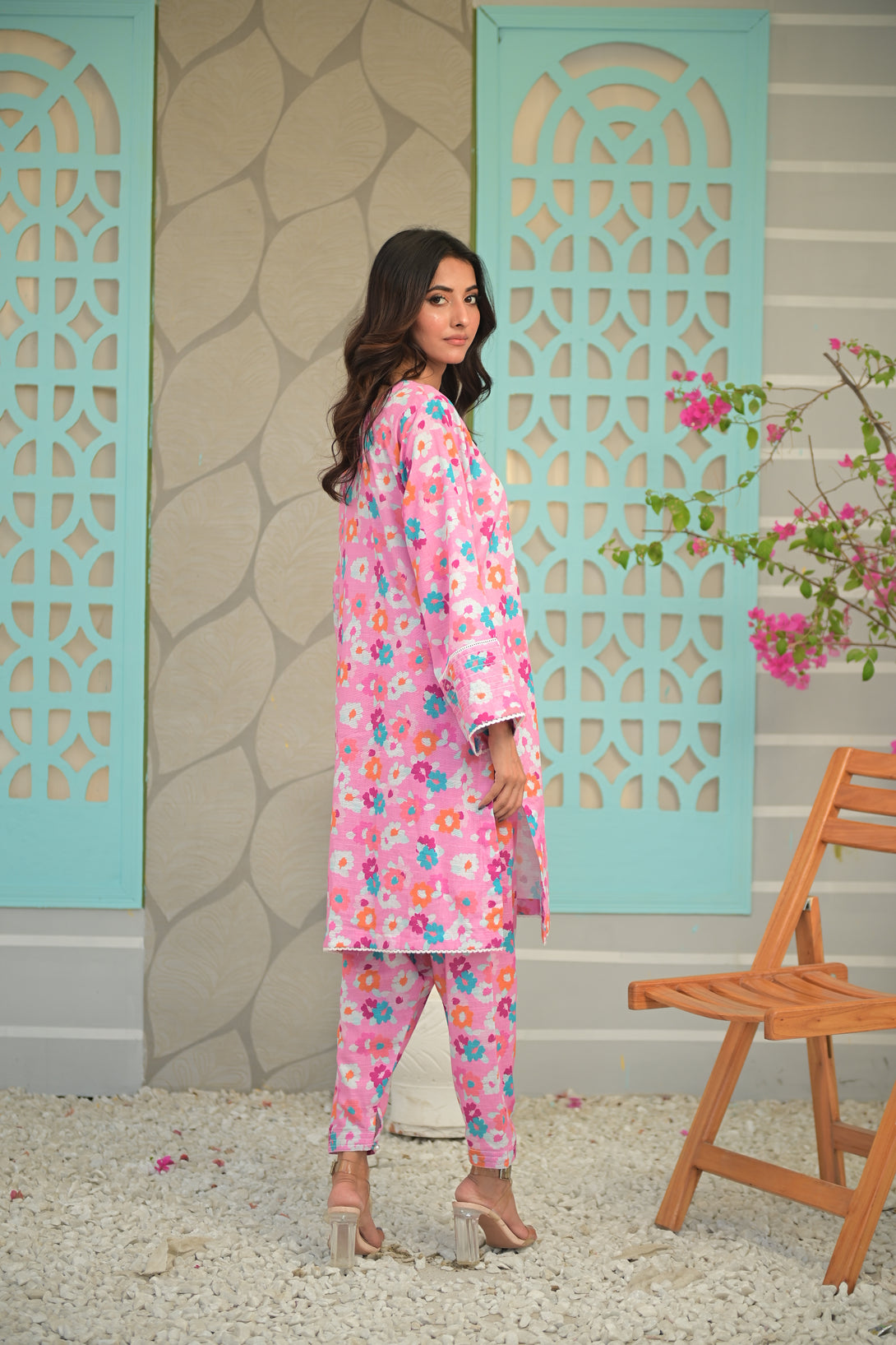 This pink printed khaddar features delicate lace work and pearl embellishments, combining traditional craftsmanship with contemporary style. Its pastel tones make it an ideal choice for winter wear, offering both warmth and elegance. Perfect for those seeking a trendy yet sophisticated look, this piece balances comfort with refined detailing.