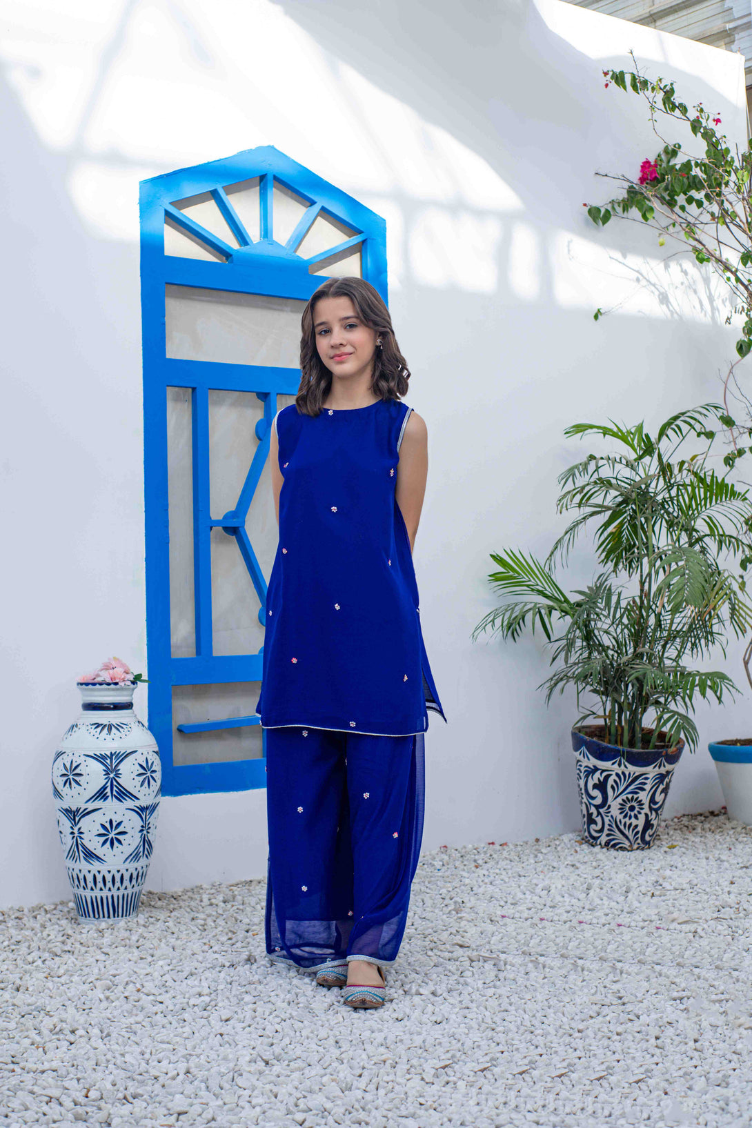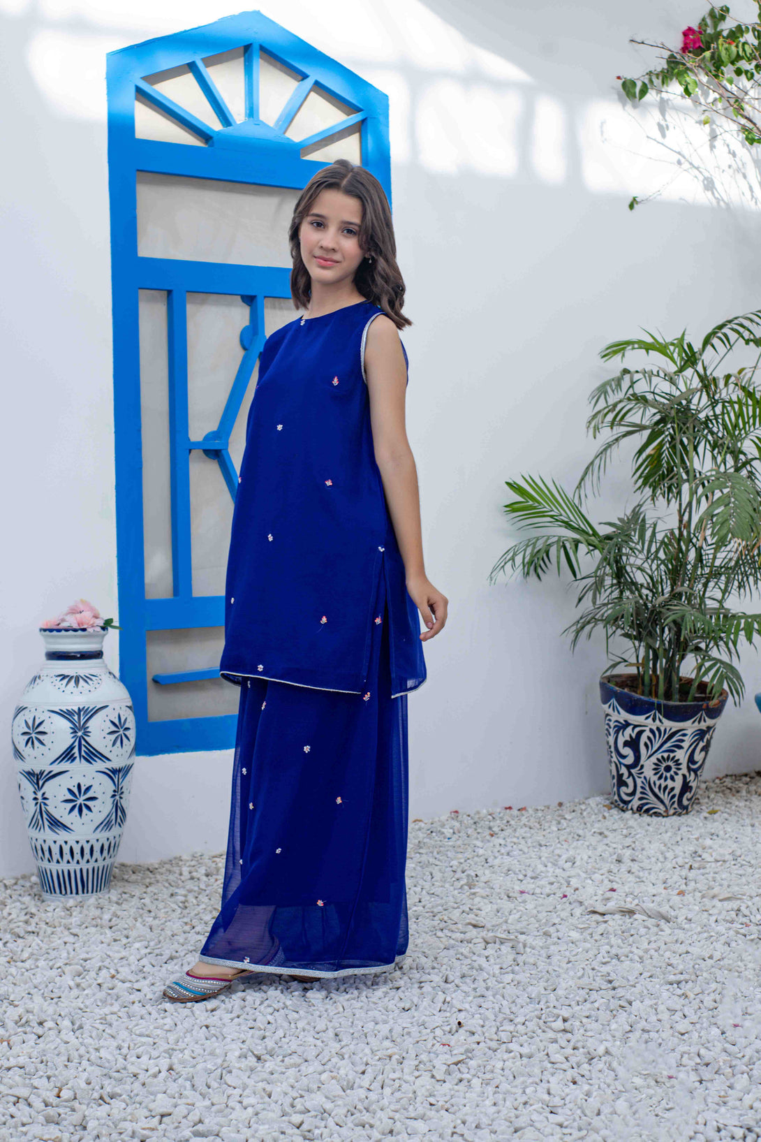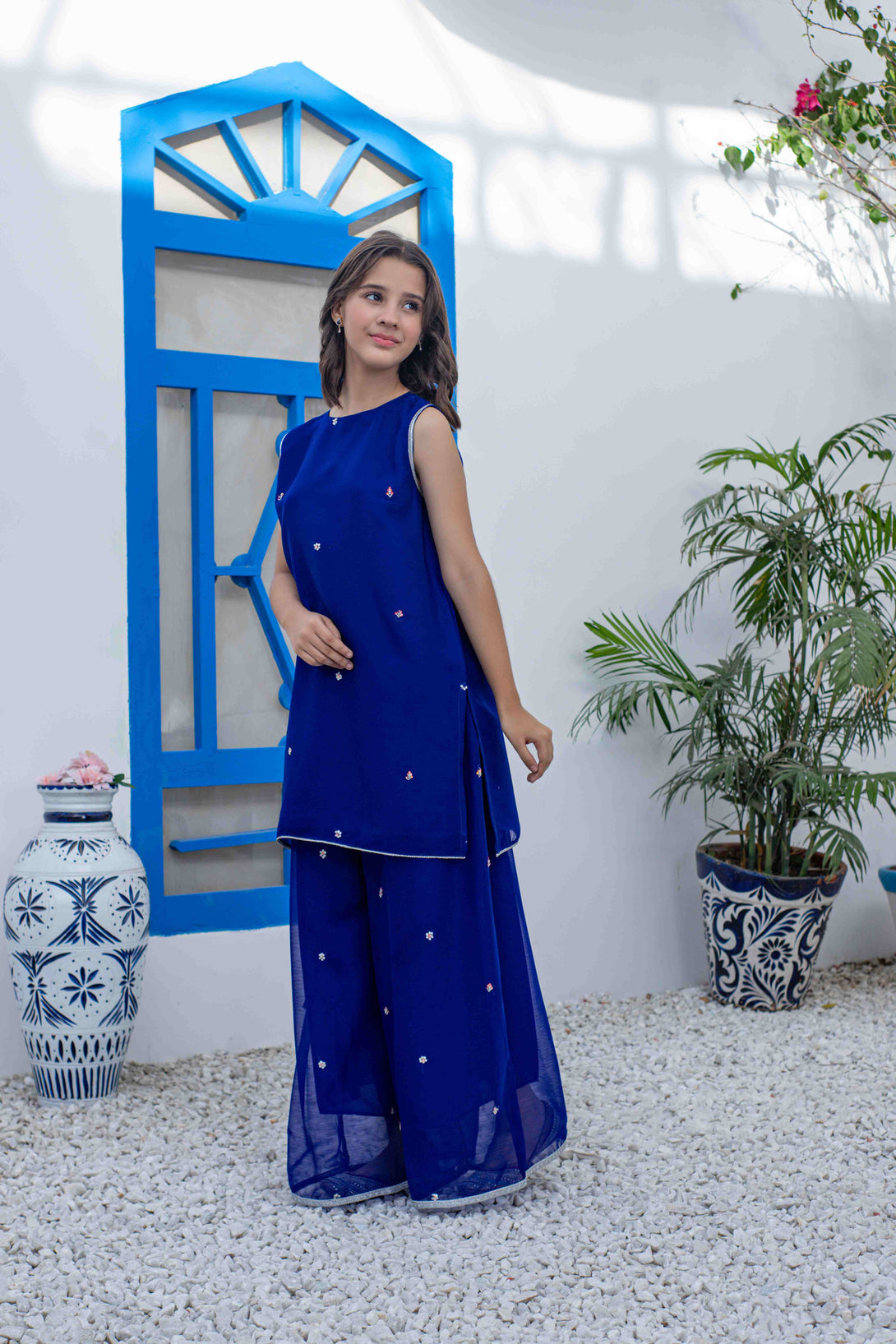 Add a touch of elegance to your wardrobe with Sapphire - the chiffon sleeveless shirt paired with flared plazo adorned with sequin work. This 2-piece set is perfect for girls' day out. Stay on-trend and stylish with Sapphire.