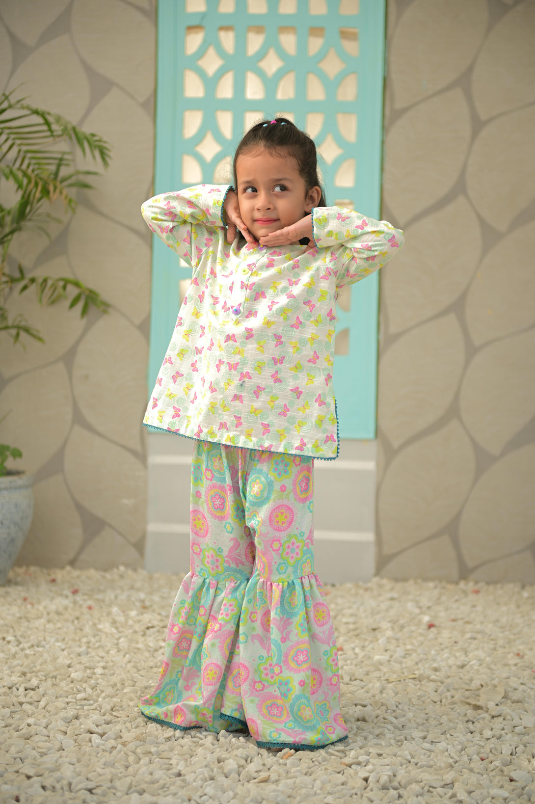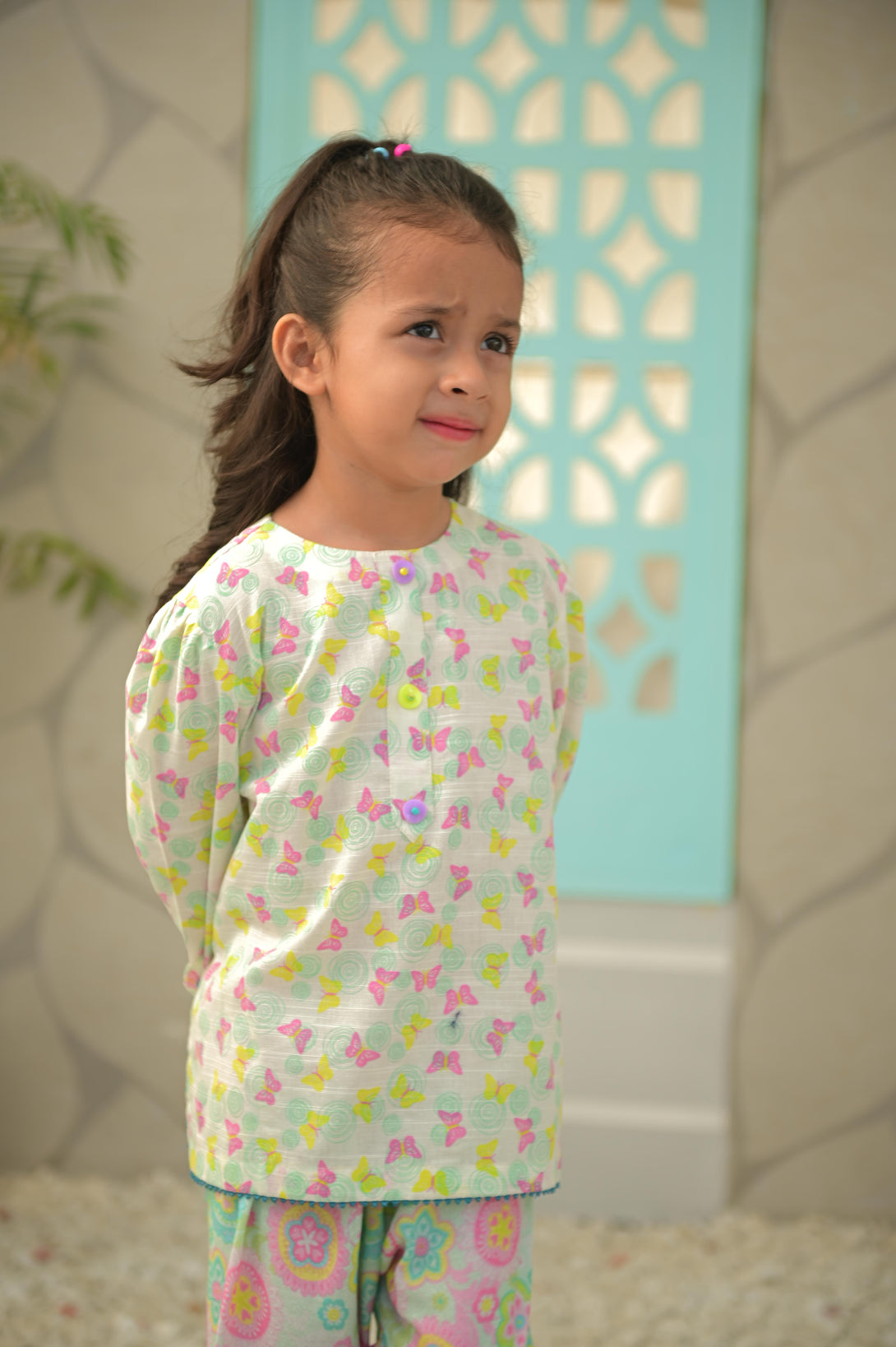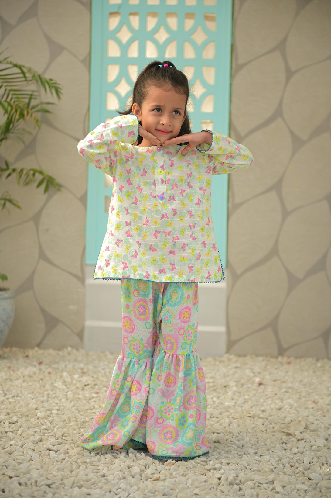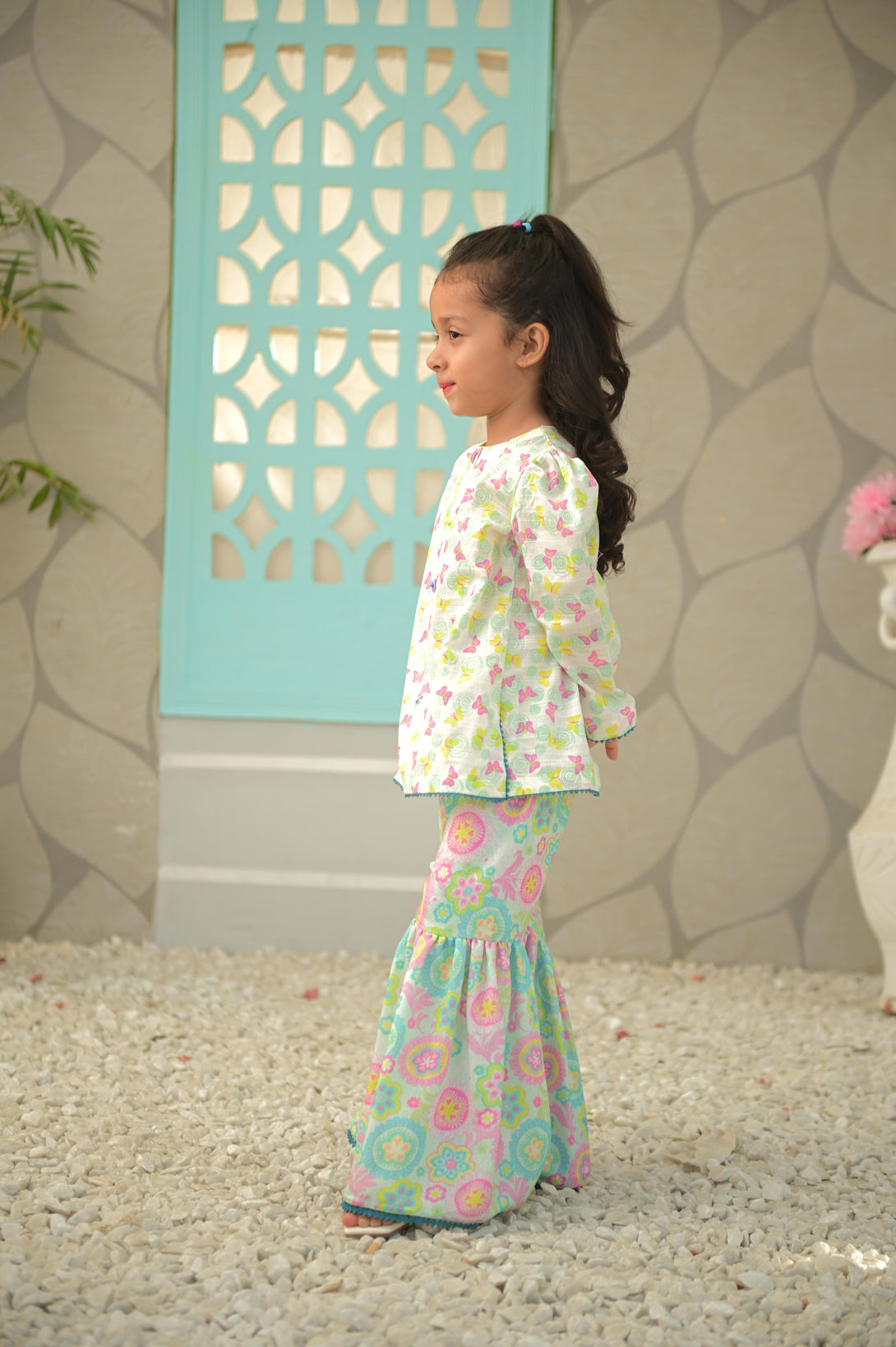 Embrace timeless elegance with this snowflake white khaddar shirt featuring a delicate butterfly screen print. Paired with a karandi gharara, it offers a traditional look enhanced by a bright palette that brings vibrancy to classic attire. Perfect for those who appreciate expert craftsmanship and cultural heritage in their wardrobe.